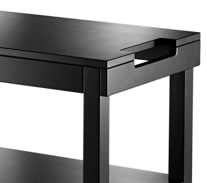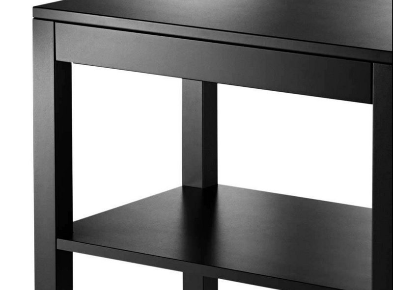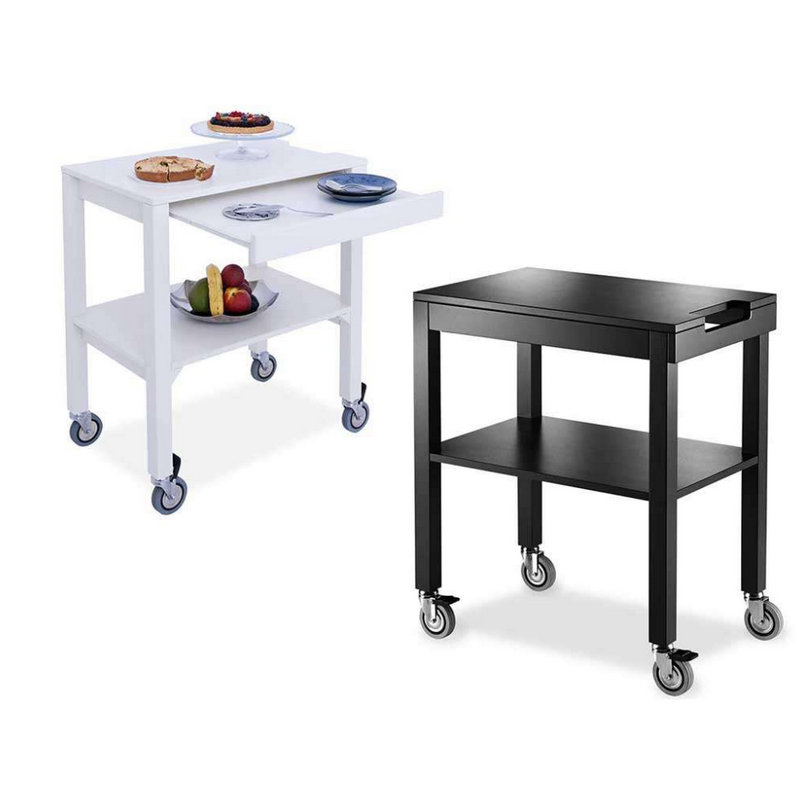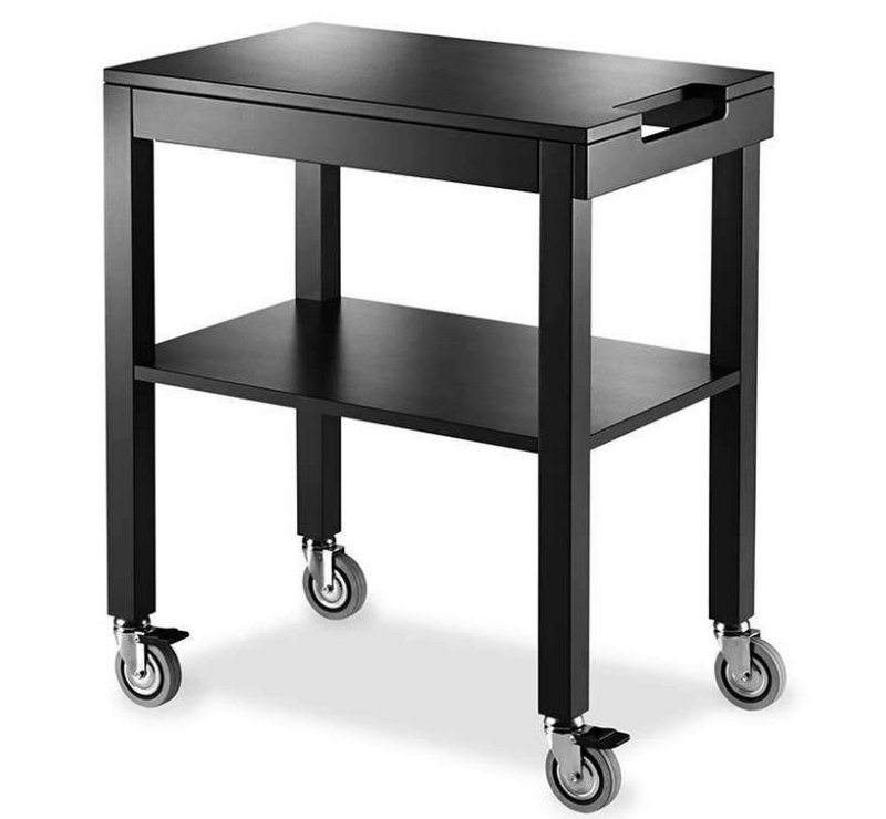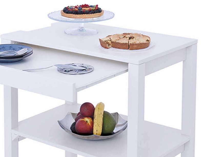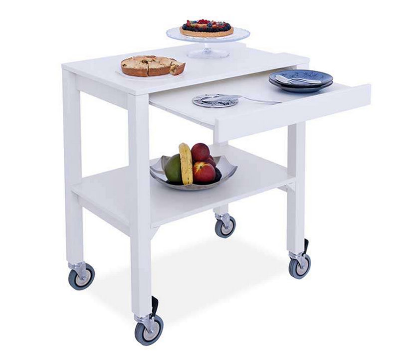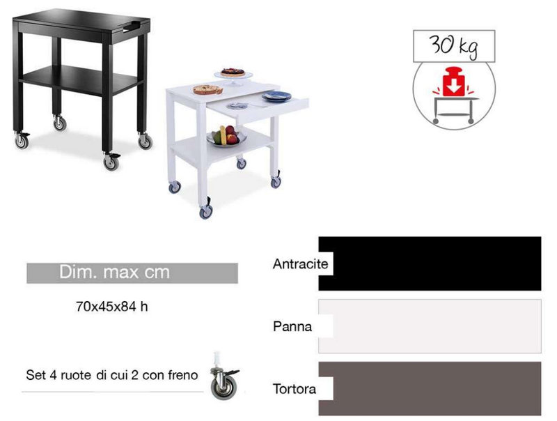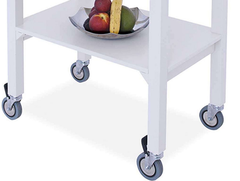 Wooden legs with square section, and wooden shelves, bogie available in three different colours, opaque lacquered; Anthracite, cream and turtora.