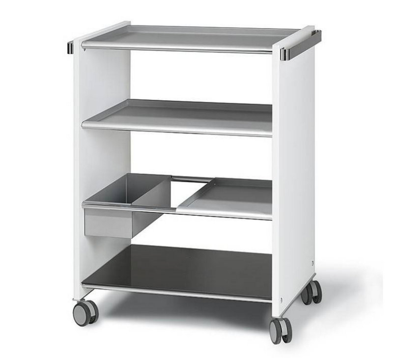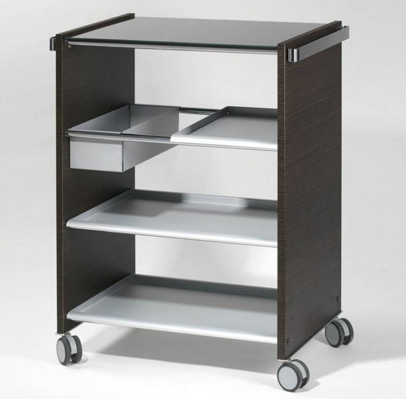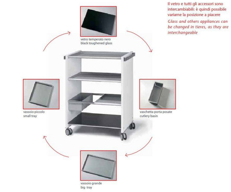 The ubiquitous shopping cart. The 18mm rolled structure is combined with tempered glass and tempered glass. The pallet comes with many useful steel detachable fittings: small pallet, two large pallets, pallets. All glass and fittings are interchangeable.
